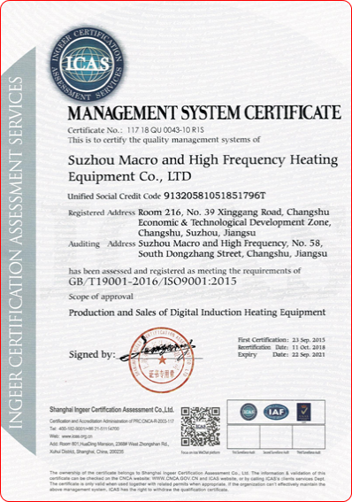 蘇州宏創高頻加熱設備有限公司位于江蘇省蘇州市常熟經濟技術開發區內,是一家科技型高新技術企業,公司擁有全數字、智能型感應加熱核心專利,專注于全系列數字化感應加熱電源及自動化生產線的研發、生產和銷售,產品涉及航空航天、機械制造、電力電子、五金機電、五金工具、制冷暖通等行業及領域。 我廠在感應加熱領域擁有數十年經驗,服務過數百個行業,超過1000多家客戶,并且持續為數十家軍工企業提供產品和服務,助力國防事業!典型客戶有:航天四院、兵器部、蘭州坦克、西航空、三角航空、中國北車、玉柴、長城汽車、比亞迪汽車...... 助力《中國制造2025計劃》,我司還自建兩個金屬感應熱處理實驗室,并且免費對外開放!您只需要把要測試的工件通過快遞或者您親自帶過來即可,我們工程師會為您現場直播實驗過程、并提供成熟的熱處理工藝解決方案,從而最大限度地降低您的設備選型風險和成本! 歡迎您蒞臨我廠參觀指導,同時我們也支持“視頻直播驗廠”,預約電話:19951013511