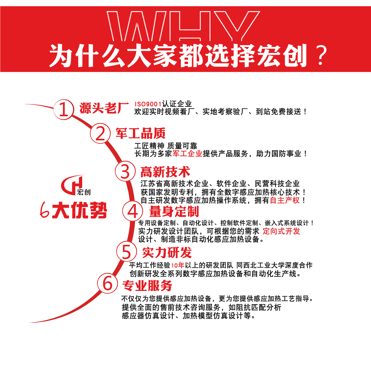 蘇州宏創高頻加熱設備有限公司位于江蘇省蘇州市常熟經濟技術開發區內,是一家科技型高新技術企業,公司擁有全數字、智能型感應加熱核心專利,專注于全系列數字化感應加熱電源及自動化生產線的研發、生產和銷售,產品涉及航空航天、機械制造、電力電子、五金機電、五金工具、制冷暖通等行業及領域。 我廠在感應加熱領域擁有數十年經驗,服務過數百個行業,超過1000多家客戶,并且持續為數十家軍工企業提供產品和服務,助力國防事業!典型客戶有:航天四院、兵器部、蘭州坦克、西航空、三角航空、中國北車、玉柴、長城汽車、比亞迪汽車...... 助力《中國制造2025計劃》,我司還自建兩個金屬感應熱處理實驗室,并且免費對外開放!您只需要把要測試的工件通過快遞或者您親自帶過來即可,我們工程師會為您現場直播實驗過程、并提供成熟的熱處理工藝解決方案,從而最大限度地降低您的設備選型風險和成本! 歡迎您蒞臨我廠參觀指導,同時我們也支持“視頻直播驗廠”,預約電話:19951013511